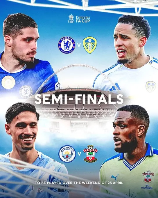 央视网消息:北京时间4月6日,足总杯半决赛抽签结果公布,曼城挑战南安普顿,切尔西对阵利兹联。